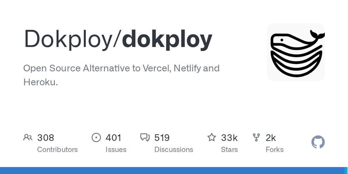Dokploy is an open-source PaaS started by Mauricio Siu (@Siumauricio) on . The project crossed its 33,400 GitHub stars, 2,401 forks, and 503 open issues by , with the latest release v0.29.2 shipping the same day. It is hosted at github.com/Dokploy/dokploy under the topics self-hosted, devops, deployment, docker, and vps.