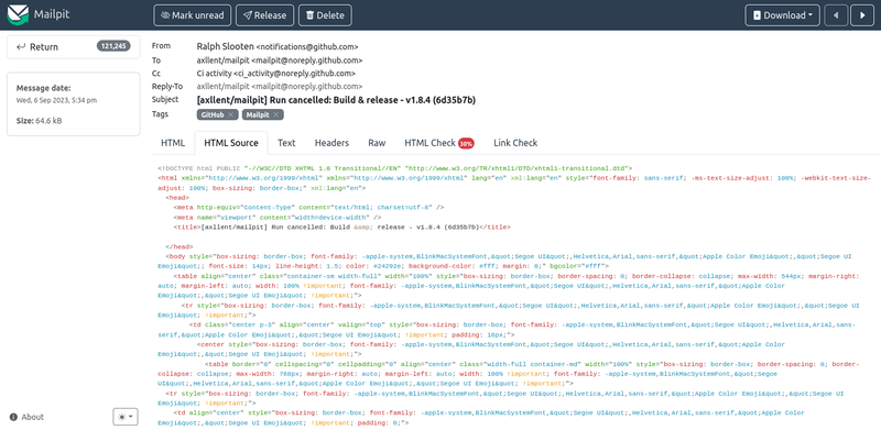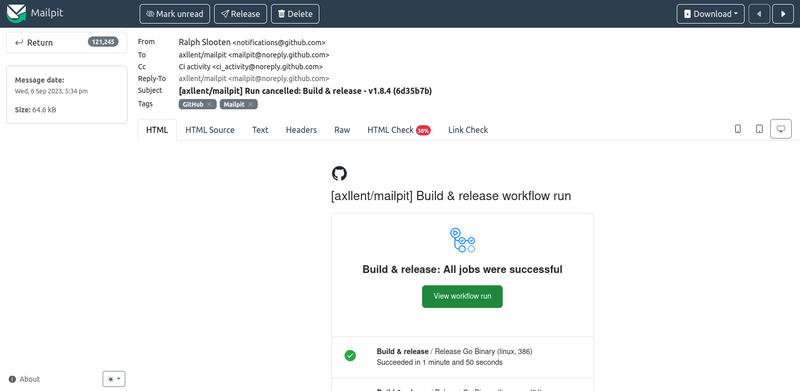 Mailpit is 100% free and MIT-licensed. There is no paid tier, no telemetry, and no signup. Donations are welcome via GitHub Sponsors, and commercial sponsorship from Mailtrap helps fund continued development.