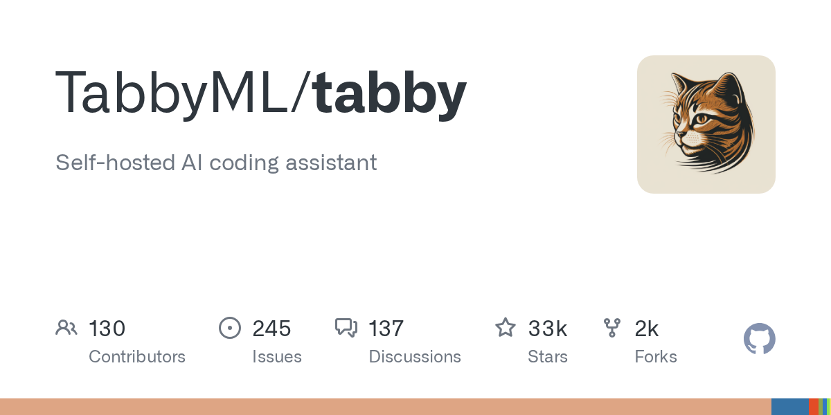 Tabby is a self-contained AI coding platform that bundles three things into a single binary: a code-completion engine, an in-IDE chat ("Inline Chat"), and an Answer Engine that retrieves context from your own repos, docs, and issues. It is built by TabbyML, Inc., the YC-backed startup that raised a $3.2M seed in October 2023. The first commit landed on , and the project debuted on Hacker News in April 2023 with a 627-point Show HN. The repo at TabbyML/tabby currently sits at 33,477 stars and 1,743 forks, and the latest stable release is v0.32.0, shipped on .