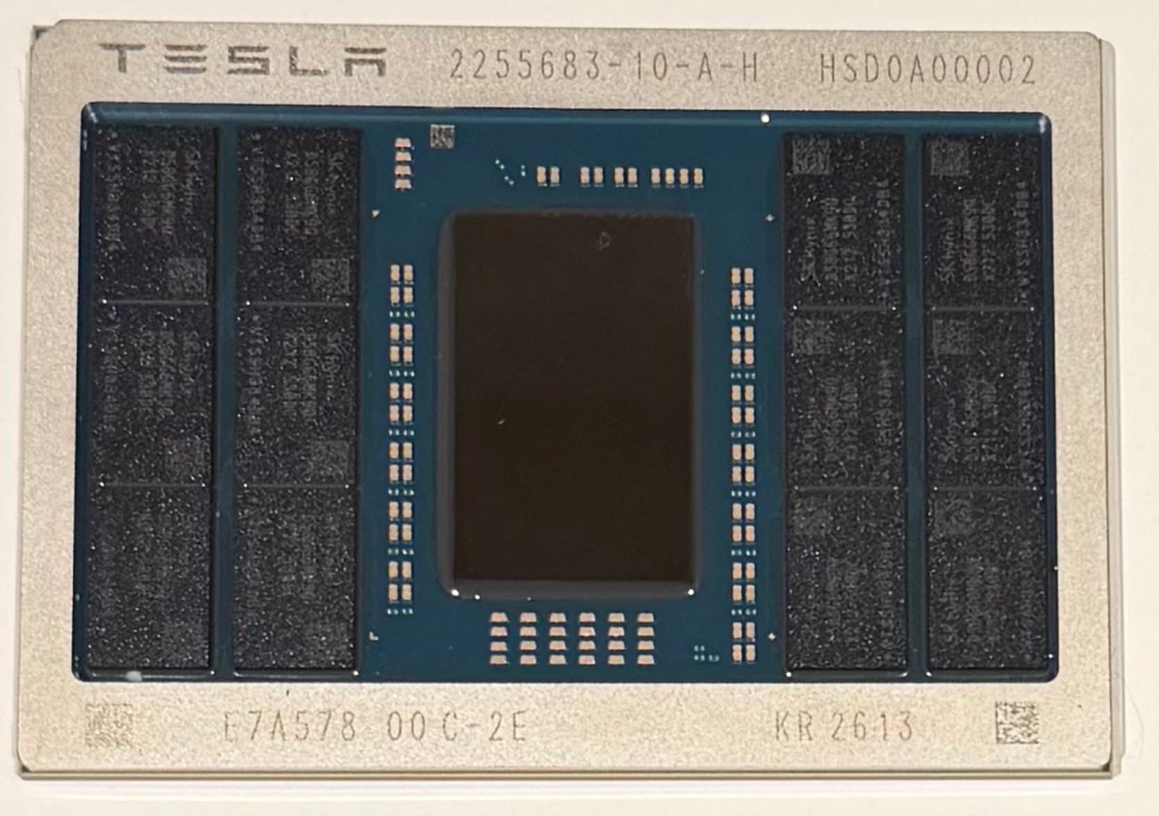 On X, Musk posted: "Congrats to the @Tesla_AI chip design team on taping out AI5! AI6, Dojo3 & other exciting chips in work." Tape-out is the moment a chip's final design leaves the engineering team and is sent to a foundry — in this case TSMC — for mask production and first silicon. Musk later showed off a physical packaged sample at a Tesla event with the marking "KR 2613," a date code that points to packaging in week 13 of 2026.