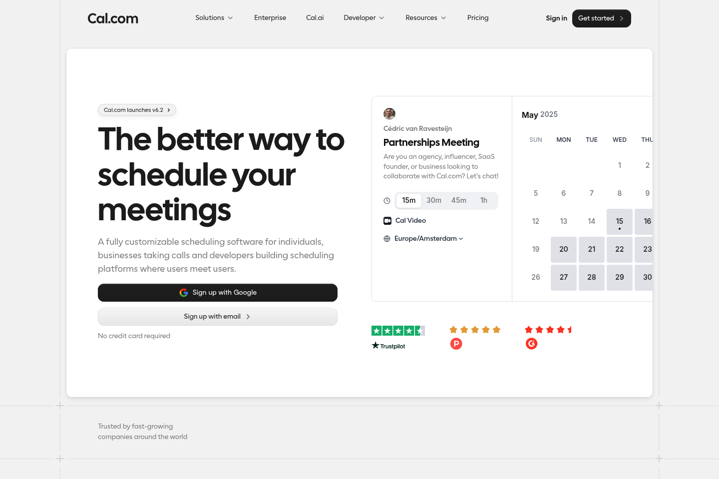 Best for: Solo developers and freelancers wanting Calendly-grade scheduling at $0; small and mid-size teams needing round-robin booking and analytics; privacy-conscious organizations requiring HIPAA or SOC 2 compliance; companies embedding scheduling into their own product via the Cal.com API.